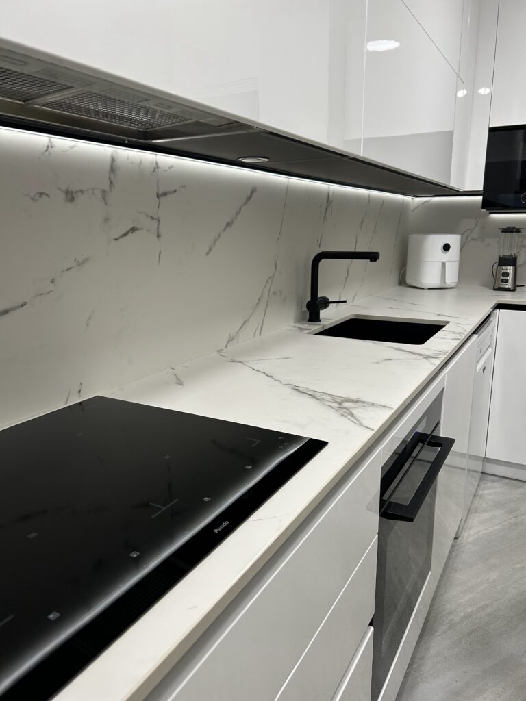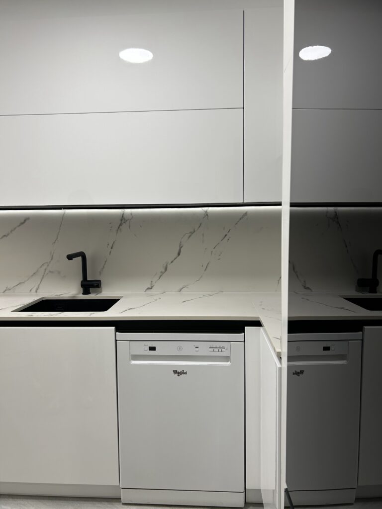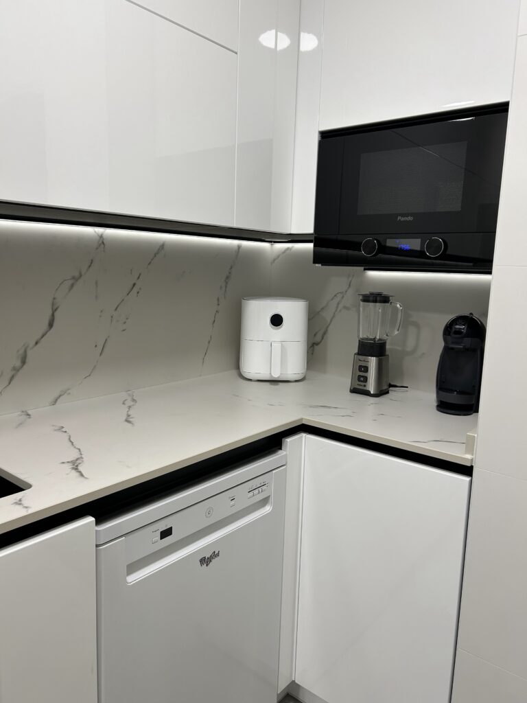 Una de las peculiaridades de este espacio es la entrada de luz limitada que tiene, por lo que todo el diseño estuvo enfocado a ganar esa sensación de luminosidad y de espacio confortable. Para ello trabajamos con puertas lacadas en blanco con brillo directo. Esta terminación no solo aporta un aspecto moderno y elegante, sino que ayuda a amplificar la poca luz natural que entra en la cocina. Además, el acabado alto brillo genera reflejos que iluminan visualmente el espacio y hacen que el ambiente resulte más amplio y despejado.