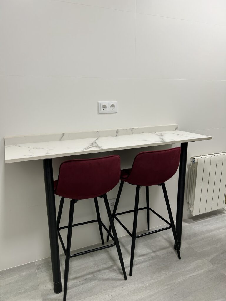 Frente a la zona principal incorporamos una barra auxiliar perfecta para desayunos, cenas rápidas o incluso como área de trabajo adicional. En esta ocasión, hemos colocado la barra a la misma altura de la encimera para genera asís una continuidad y un posible espacio extra de trabajo.