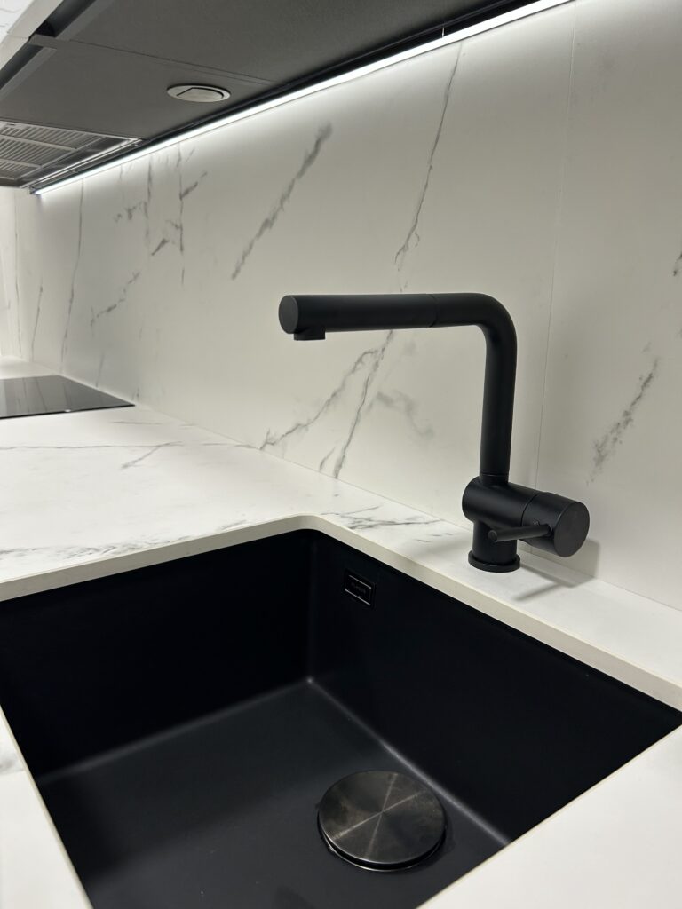 La encimera está realizada en porcelánico Dekton, un material altamente resistente y sin porosidad. Entre sus ventajas: