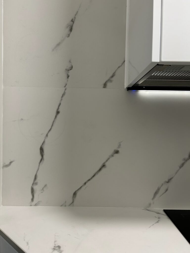 El mismo material se utilizó también para el revestimiento de la pared, logrando una estética continua y muy fácil de limpiar. Una recomendación que ya hemos hecho varias veces en nuestras redes sociales para evitar las zonas sucias.